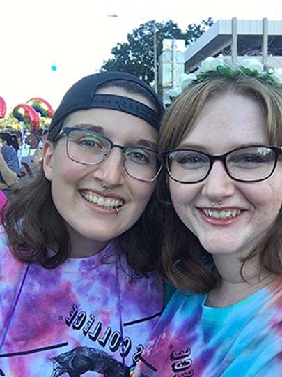 American studies and theatre double major Kalli Joslin ’19 served as president of Spectrum from 2016 to 2018. She found out about the student organization from her RCC peer mentor and credits the club with helping her make her very first college friends—including the woman who would go on to become her wife, whom Joslin met at her very first Spectrum meeting in 2015.