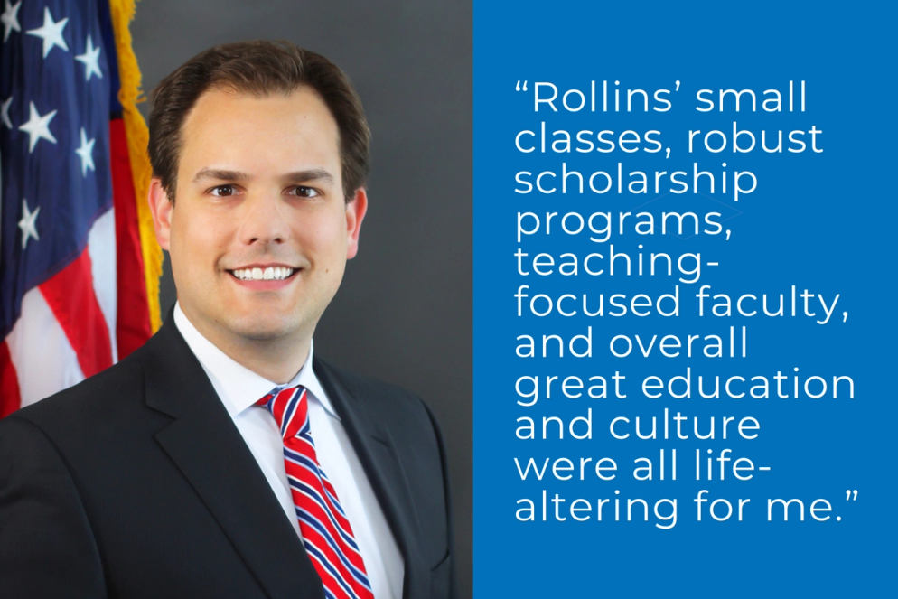 “Rollins was the best educational experience of my life,” says Fernandez, who earned his law degree from the University of Florida. “I received a broad educational foundation on which I was able to build when doing my master’s and doctoral degrees and into my career. Rollins’ small classes, teaching-focused professors, robust scholarship programs, and overall great education and culture were all life-altering for me.”