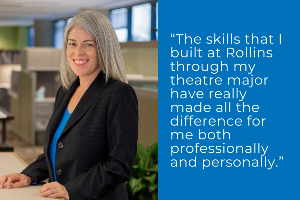 “The foundation I received at Rollins has greatly contributed to my professional success,” says Reynolds, who majored in theatre and credits her liberal arts education for preparing her anything. “People may be surprised to learn how similar running a business is to running a theatre production—comfort with public speaking and the ability to tell a story are key differentiators in the public and private sectors. These skills, which I built at Rollins, have really made all the difference for me professionally and personally.”