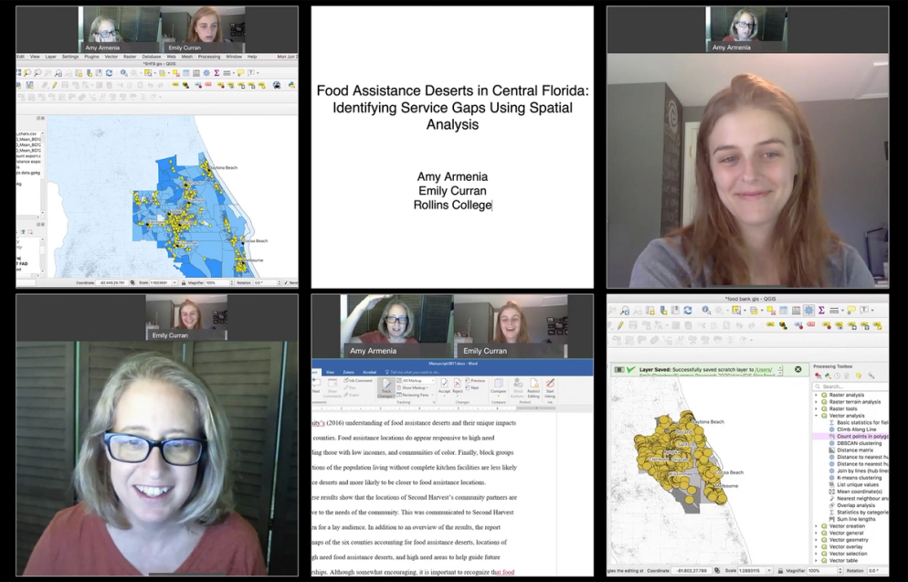 Emily Curran ’22’s experience this summer alongside sociology professor Amy Armenia in Rollins’ Student-Faculty Collaborative Scholarship Program has affirmed her plans to pursue a graduate degree in sociology. Together they creatively pivoted to a virtual working environment in which they partnered with Second Harvest Food Bank to research food-assistance deserts in Central Florida, using spatial analysis to identify service gaps in the area’s six counties.