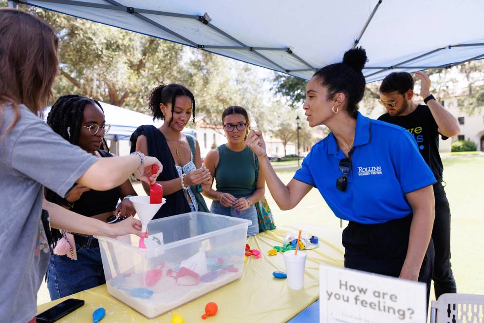 Rollins is committed to the health and well-being of our community. The Rollins Wellness Center hosted a Nine Dimensions of Wellness tent out on Mills Lawn for students to learn about the many ways they can take care of themselves and each other (bonus takeaway: fun swag).